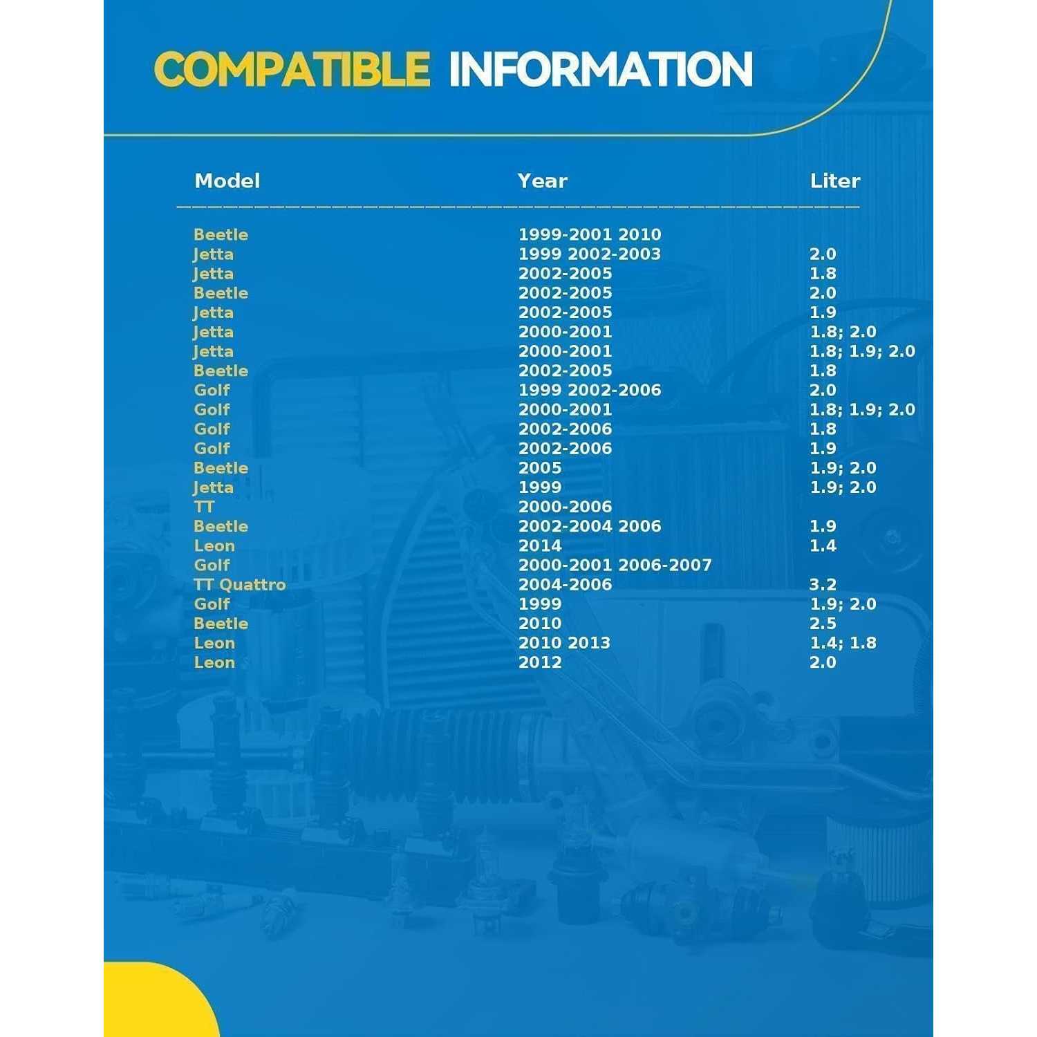 • Fitment: 1999-2006 Golf, 2010-2010 Beetle, 2000-2006 TT, 1999-2005 Je-t-ta, 1999-2006 Beetle, 2000-2006 TT Quattro