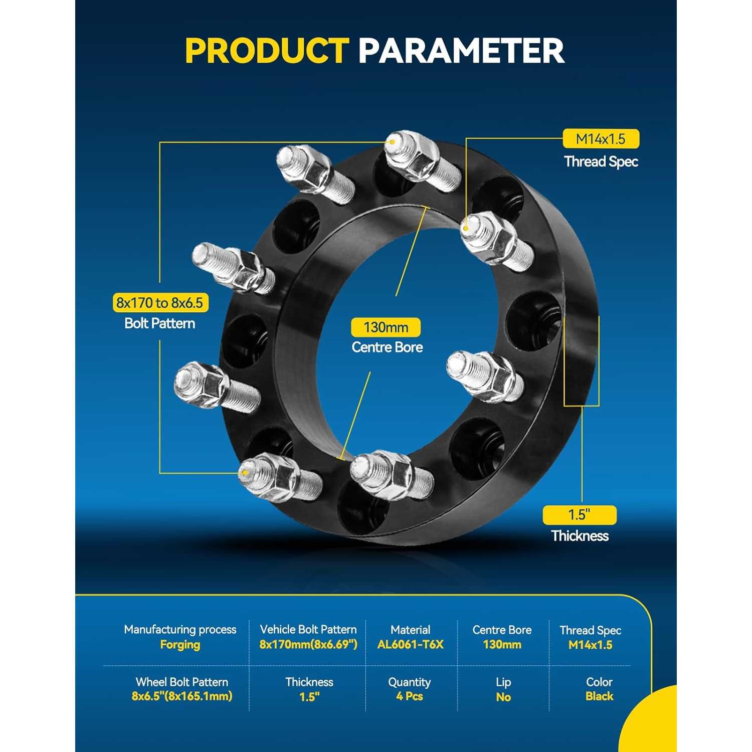 [Wheel Adapters Specification] --- Vehicle Bolt Pattern: 8x170mm(8x6.69") ; | Wheel Bolt Pattern: 8x6.5"(8x165.1mm) ; | Thickness: 1.5 inch(38mm) ; | Thread Pitch: M14x1.5 ; | Hub Bore: 130mm ; | Recommended torque: 85-90 ft/lbs. !!! Note: If the length of the vehicle bolts exceed the thickness of the wheel adapters, you need to cut the vehicle bolts