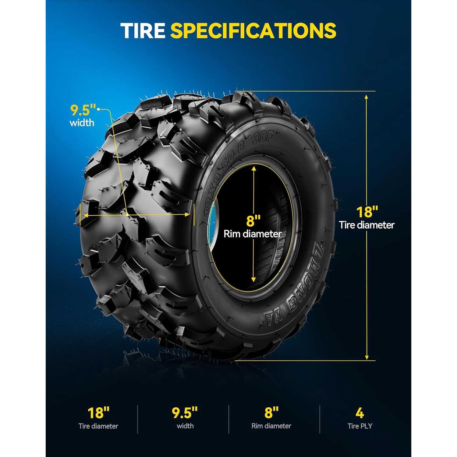 • ✔️ [Tire Parameter] – Tire Size: 18x9.5-8 in;Overall Diameter: 18 in;Overall Width: 9.5 in;Rim Diameter: 8 in;Rim Width: 7 in;Ply Rating: 4 Ply Rated;Max load-index(lbs): 227;Speed Rating: F;Section Width: 238 mm;Tread Depth: 15 mm;Aspect Ratio: 53;Material: Rubber;PSI: 14