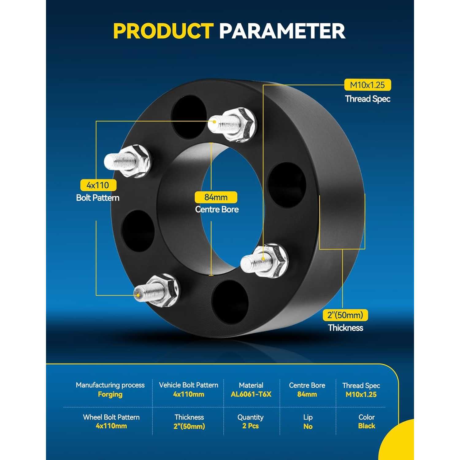 [Wheel Spacers Specification] --- Bolt Pattern: 4x110mm ; | Thickness: 2 inch(50.8mm) ; | Thread Pitch: M10x1.25 ; | Hub Bore: 84mm ; | Recommended torque: 45-55 ft/lbs. !!! Note: If the length of the vehicle bolts exceed the thickness of the wheel adapters, you need to cut the vehicle bolts