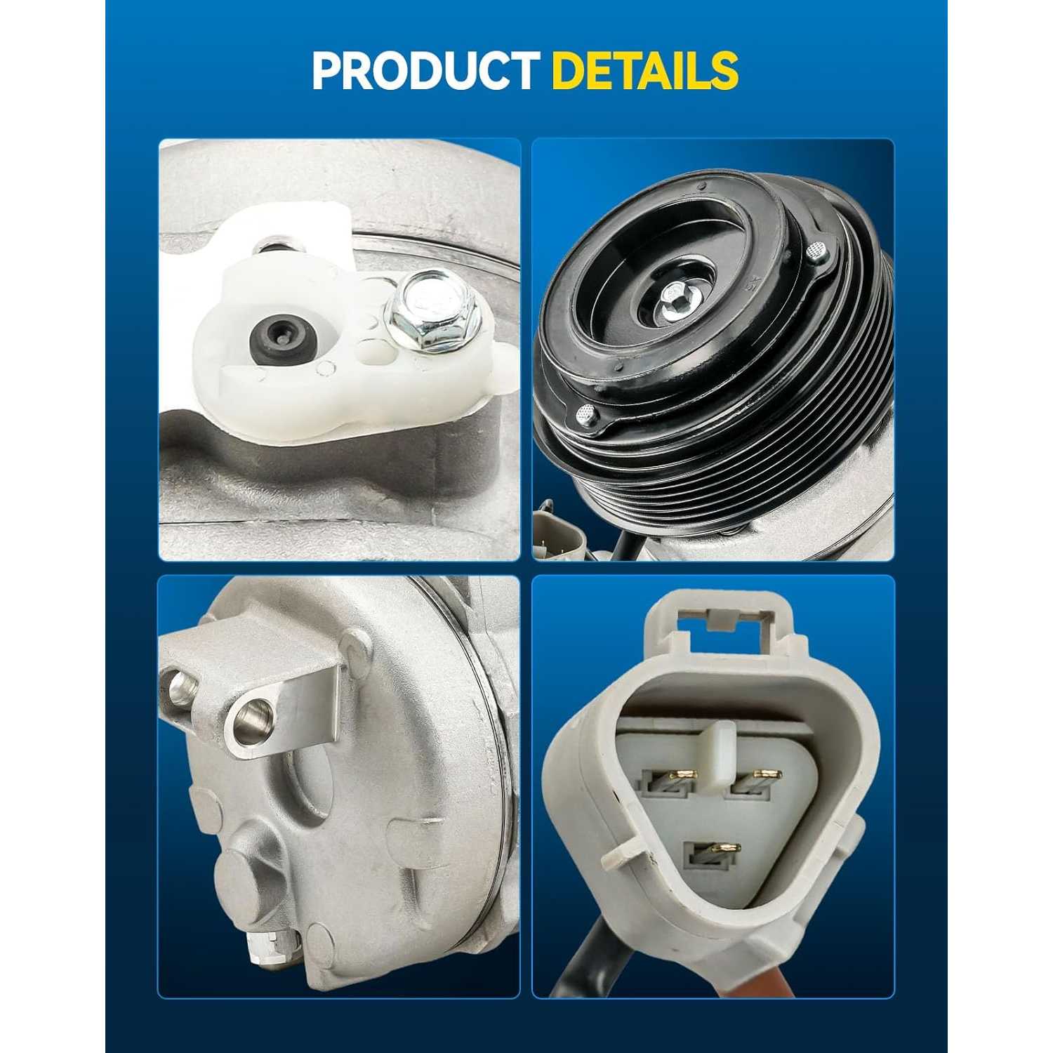 Ensures Fast Refrigeration And Defogging: ①Oil Type:PAG 46;②R-efrigerant Type:R134a;③Pulley Grooves: 6;④Pulley Diameter:4.50 inch ;⑤Compressor type:10s20c;⑥Pulley type:Multi-Groove Serpentine;⑦Clutch Included: Yes; ⑧Noise:<72 dB.Our air conditioning compressor supply Stable and Consistent Cooling, It ensures stable and consistent cooling throughout your drive.