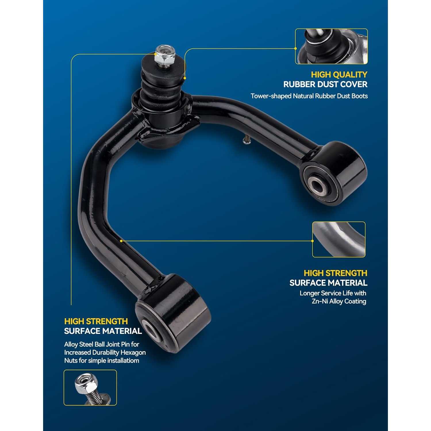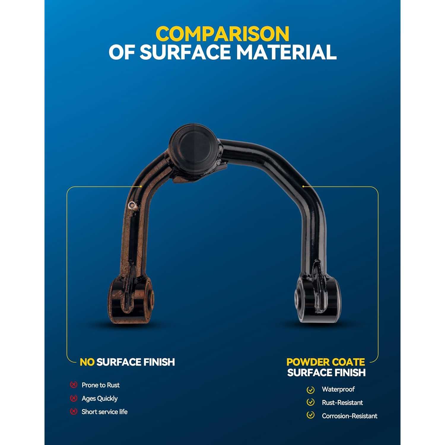 High Quality: Polishing and rust prevention; the anti-corrosion coating on the control arm can prolong the service life. All materials used for the control arm coating are environmentally friendly