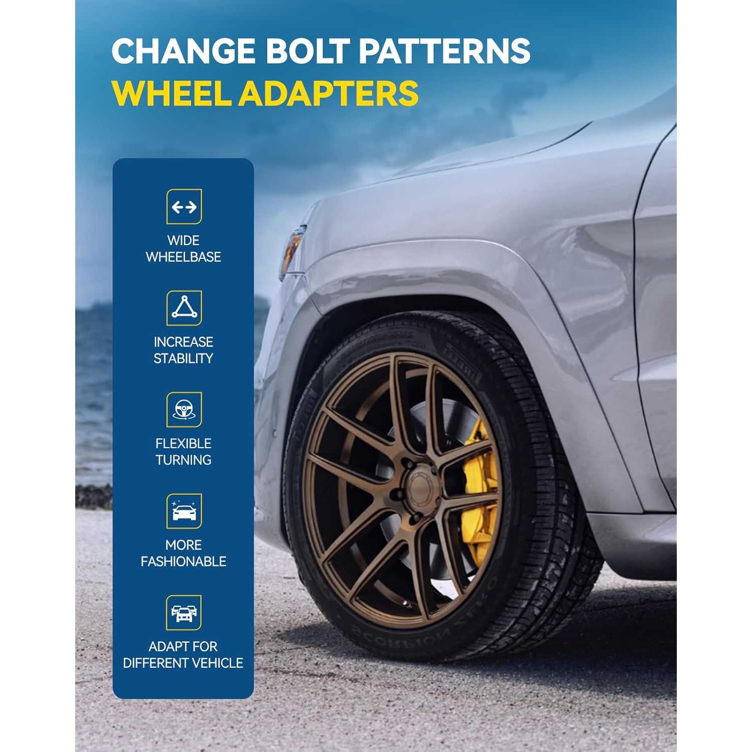 [Aggressive Driving Experience] --- These 4x100 to 4x4.5 wheel adapters change bolt pattern,it help you to fit the wheel of one factory vehicle to the hub of a different vehicle. The Wheel Adapters can move your wheels further out from the wheel hub, mount larger wheel or tires. Installing the wheel adapters can fix brake caliper clearance issues, correct tire friction issues, increase cornering stability,giving an aggressive performance to your vehicle
