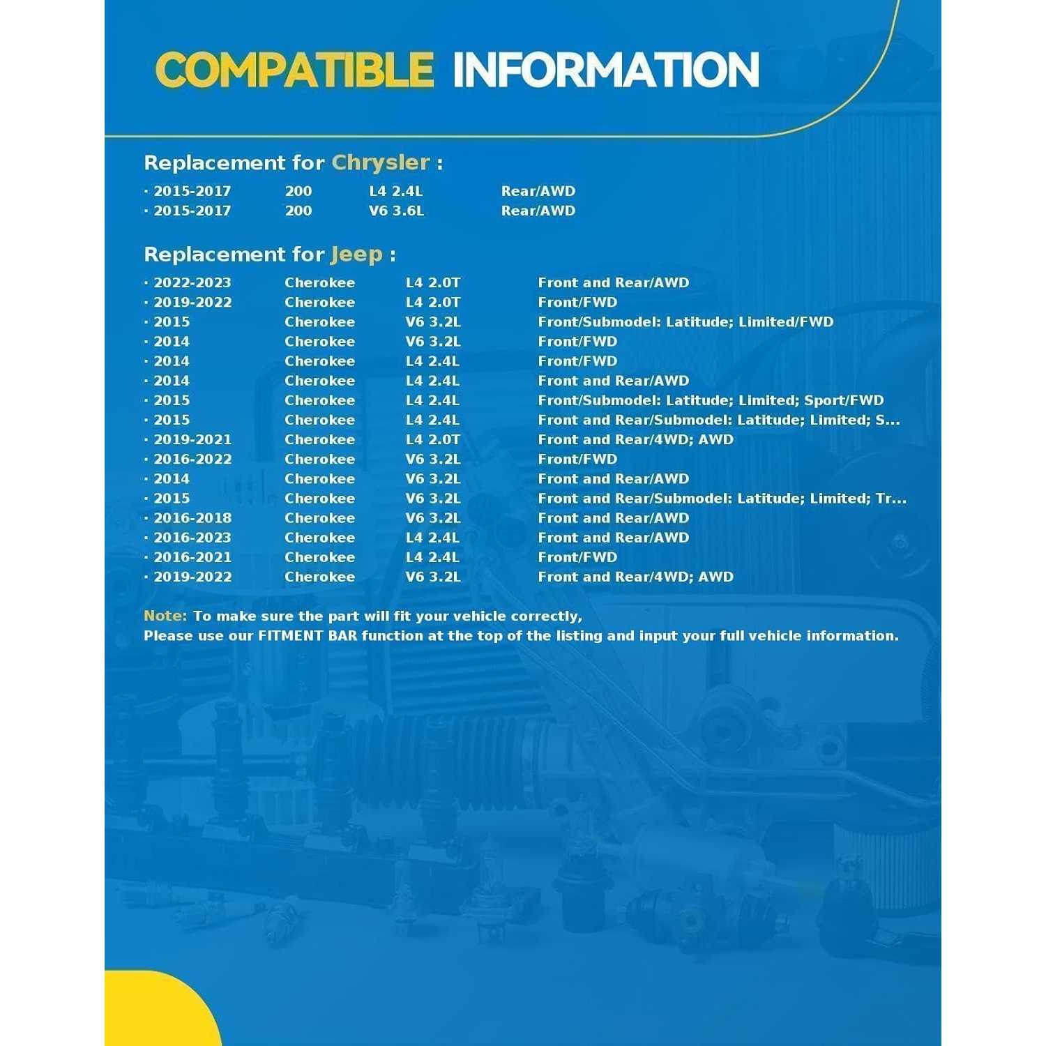 Compatibility: Wheel Bearing and Hub Assembly for 2014-2023 Jeep Cherokee AWD Front and Rear, 2014-2022 Jeep Cherokee FWD Front, 2019-2022 Jeep Cherokee 4WD Front and Rear, 2015-2017 Chrysler 200 AWD Rear