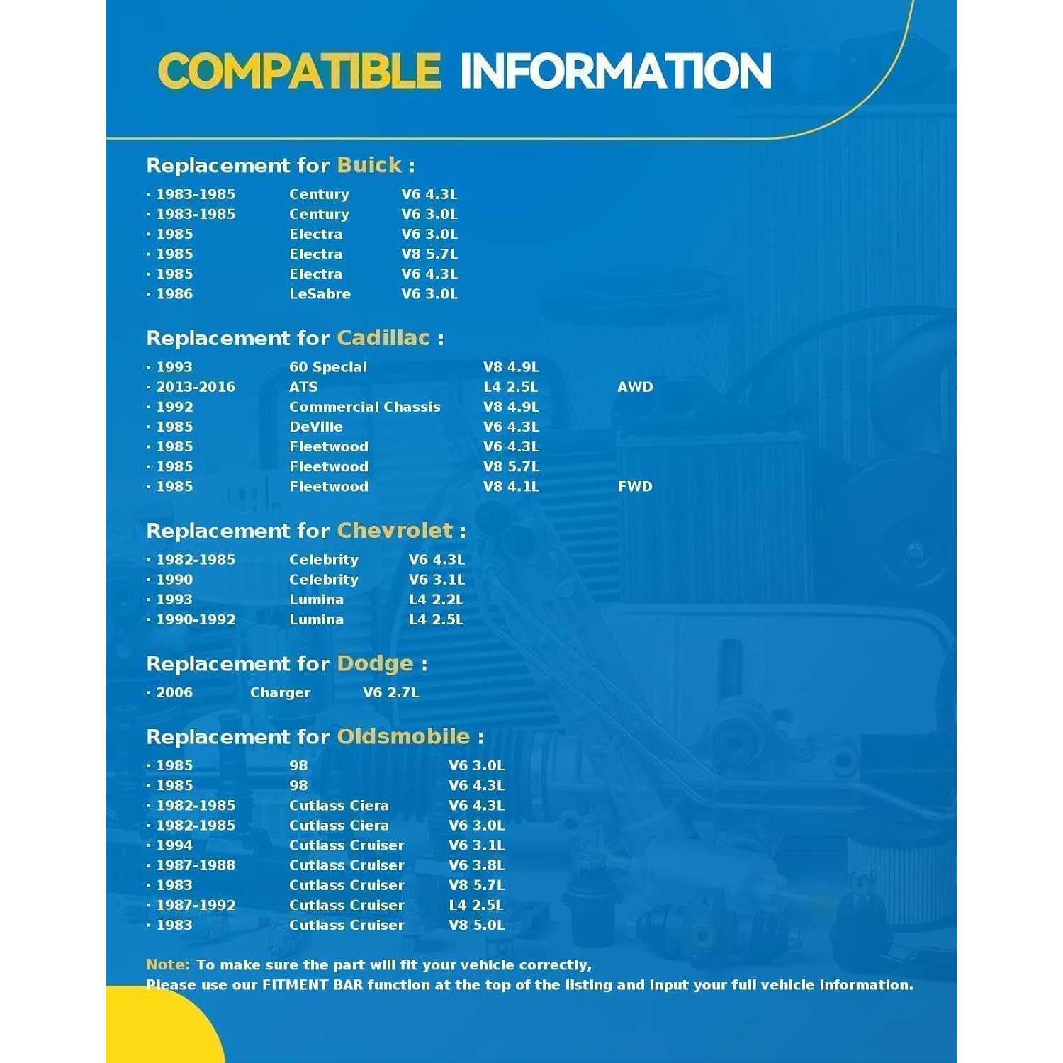 [Vehicle Application] --- The 5x115 Wheel Spacer set replacement for 2016-2022 Malibu 1.5/2.0L Turbocharged 122/91cid GAS L4; 2013-2015 Cruze 1.4/1.8L Naturally Aspirated/Turbocharged 110/83cid FLEX/GAS L4; ATS 3.6L AWD Naturally Aspirated 217cid FLEX V6; 2006-2011 Impala 3.5L Naturally Aspirated 213cid FLEX V6; DTS 4.6L Naturally Aspirated 281cid GAS V8; Lucerne 4.6L Naturally Aspirated 281cid GAS V8; 2018-2021 Equinox 1.5L 4WD Turbocharged 91cid GAS L4; Terrain 1.5L 4WD Turbocharged