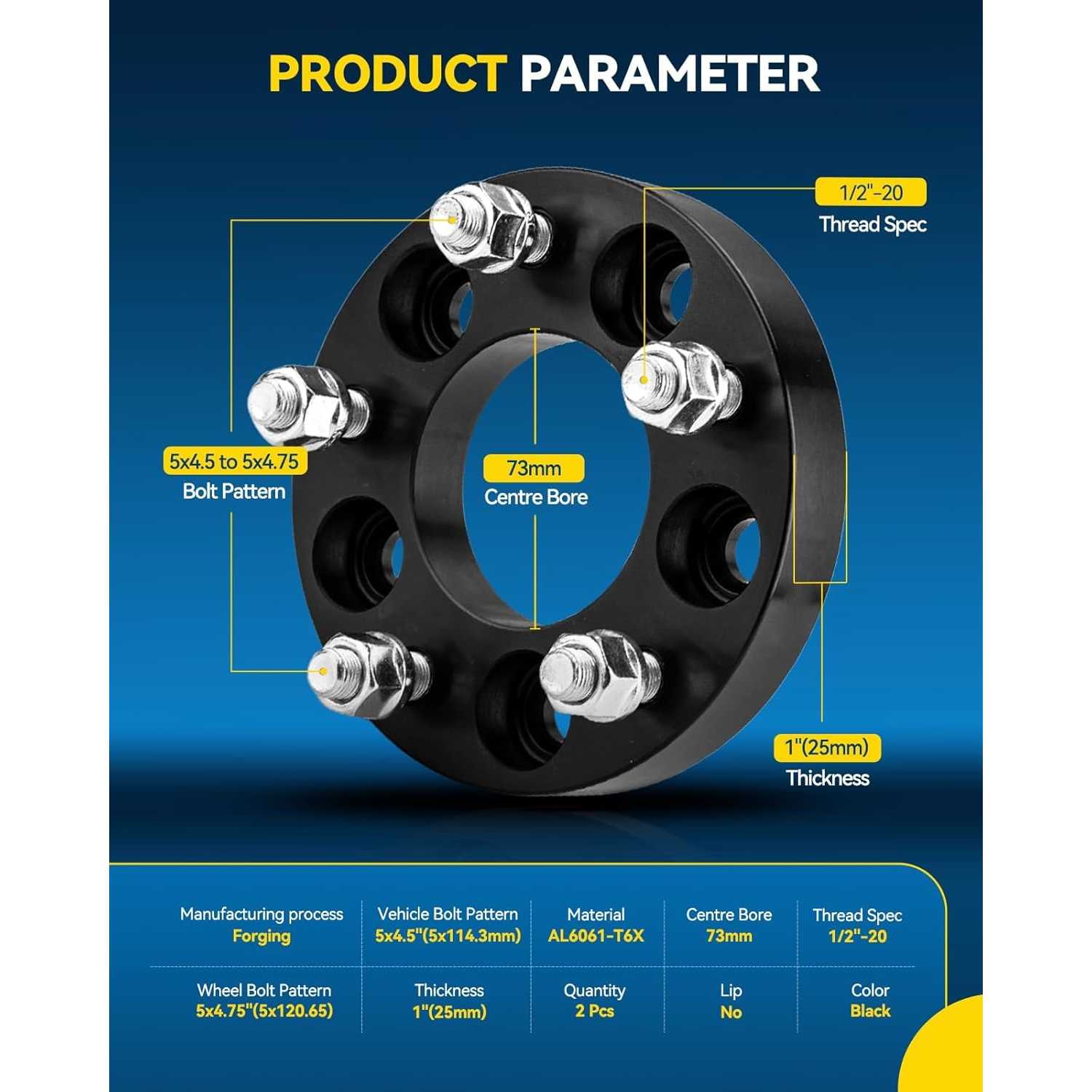 [Wheel Adapters Specification] --- Vehicle Bolt Pattern: 5x4.5"(5x114.3mm) ; | Wheel Bolt Pattern: 5x4.75"(5x120.65) ; | Thickness: 1.25 inch ; | Thread Pitch: 1/2"x20 ; | Hub Bore: 70.3mm ; | Recommended torque: 75-85 ft/lbs. !!! Note: If the length of the vehicle bolts exceed the thickness of the wheel adapters, you need to cut the vehicle bolts