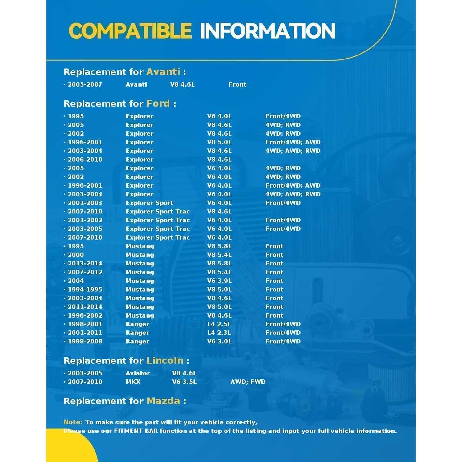 [Vehicle Application] --- The 5x4.5 Wheel Spacer set replacement for ALL For:; 2002-2010 Explorer 4.0/4.6L 4WD/RWD Naturally Aspirated SOHC V6/V8; 2007-2010 Edge 3.5L AWD/FWD Naturally Aspirated DOHC V6; MKX 3.5L AWD/FWD Naturally Aspirated DOHC V6; Explorer Sport Trac 4.0/4.6L 4WD/RWD Naturally Aspirated SOHC V6/V8; 2002-2009 Mountaineer 4.0/4.6L AWD/RWD Naturally Aspirated SOHC V6/V8; 2003-2005 Aviator 4.6L Naturally Aspirated DOHC V8; Explorer 4.6L AWD Naturally Aspirated SOHC V8;