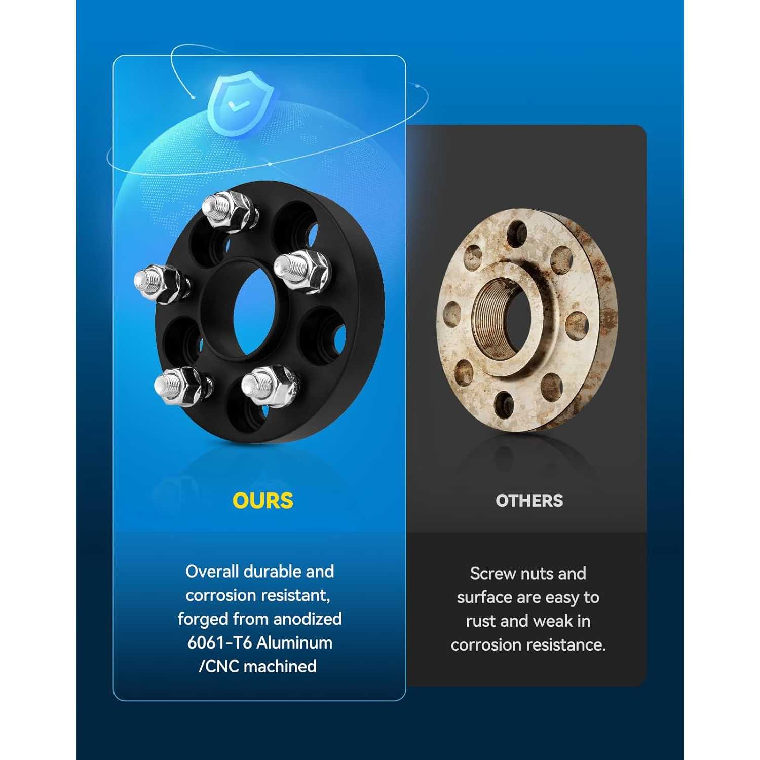 [High Quality] ---5x4.75 Wheel Spacer is truly forged from lightweight anodized 6061-T6 aircraft-grade aluminum alloy, the surface anodized coating can protect the metal surface from environmental erosion under extreme conditions. CNC precisely machined, with pre-installed heat treated 12.9 grade carbon steel studs, 7-10 times the corrosion resistance of similar products. The installation fit more better, so as to prevent wheel vibration and maintain the stock driving