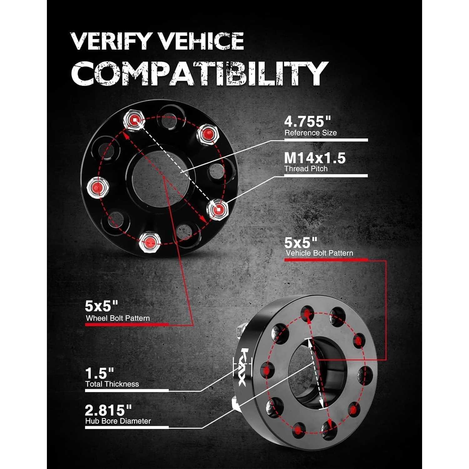 ➤KAX Bolt On Wheel Spacers Parameter : Vehicle & Wheels Bolt Pattern Must Be 5x5"(5x127mm) || 1.5 inch(38mm) Thick || M14x1.5 Threaded Studs/Nuts || 71.5mm Center Bore with lip || Recommended torque: 85-90 ft/lbs. Package includes 4pcs wheel spacers, 10.9 class split nuts and professional instruction manual