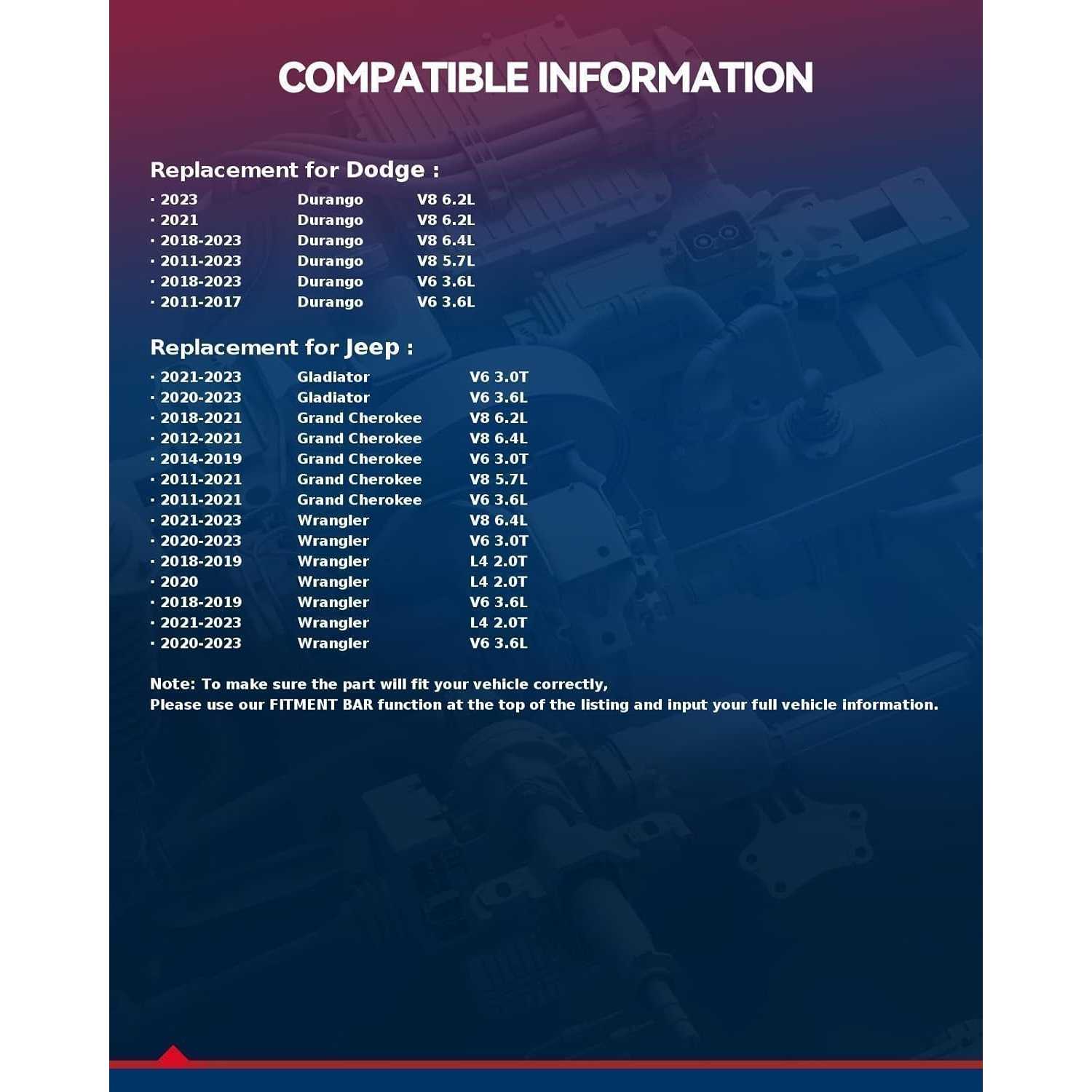 ➤Compatibility : 5x5 wheel spacers 1.5 inch are compatible with 2011-2021 Grand Cherokee 3.6/5.7L Naturally Aspirated FLEX/GAS V6/V8; 2018-2023 Wrangler 3.6L Naturally Aspirated GAS V6; Durango 3.6/6.4L Naturally Aspirated GAS V6/V8; 2020-2023 Gladiator 3.6L Naturally Aspirated GAS V6; Wrangler 2.0/3.0/3.6L Naturally Aspirated/Turbocharged DIESEL/GAS/MILD HYBRID EV-GAS (MHEV) L4/V6; 2011-2017 Durango 3.6L Naturally Aspirated FLEX V6; 2011-2023 Durango 5.7L Naturally Aspirated GAS