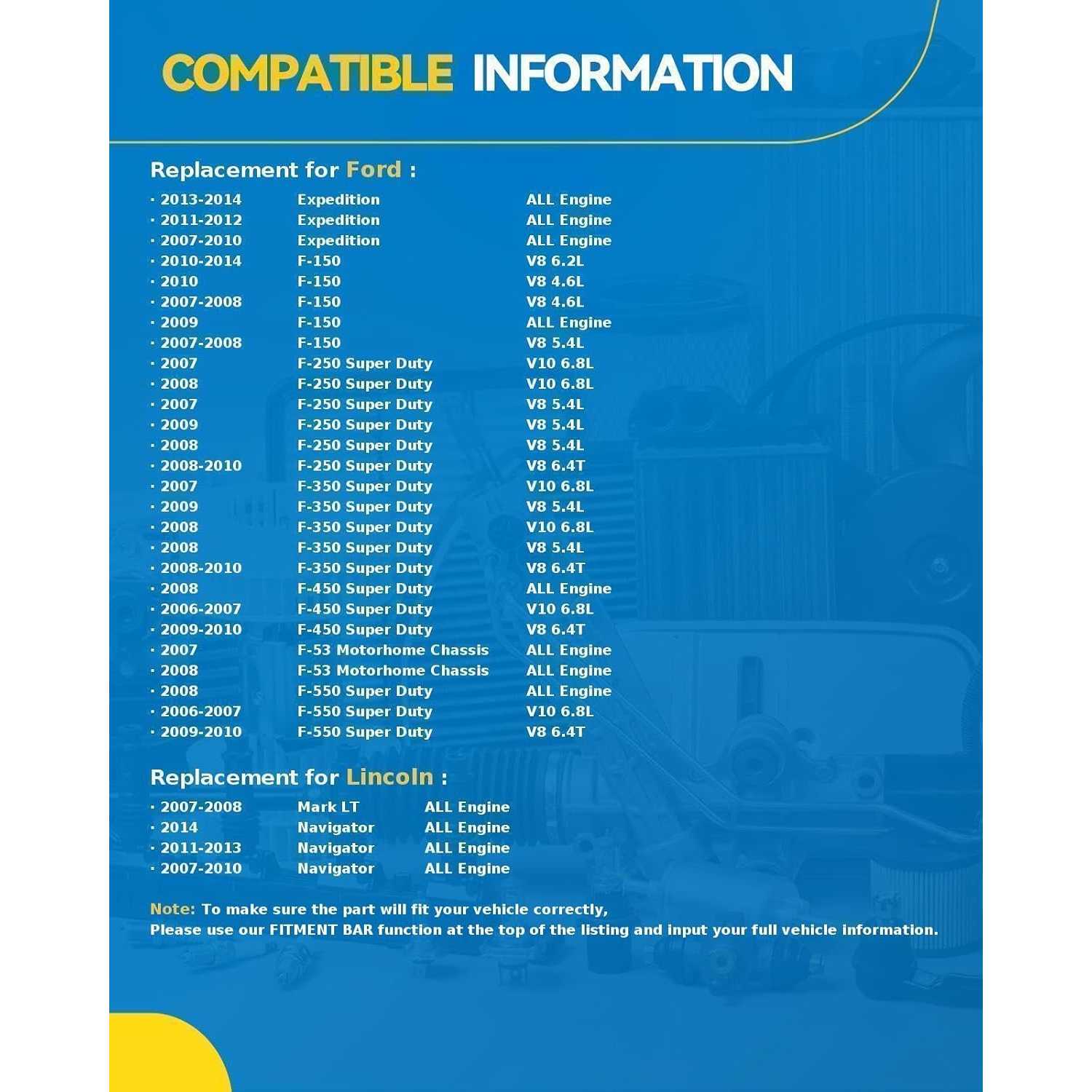PERFECT FIT - A perfect fit for F150 2007-2008 5.4L, F150 2007-2008 2010 4.6L, Expedition 2007-2014, F150 2009, F250 Super Duty 2008-2010 6.4T, F350 Super Duty 2008-2010 6.4T, F250 Super Duty 2007-2009 5.4L, Navigator 2007-2014, F150 2010-2014 6.2L, F350 Super Duty 2008-2009 5.4L, F350 Super Duty 2007-2008 6.8L, Mark LT 2007-2008, F250 Super Duty 2007-2008 6.8L, F-550 Super Duty 2006-2007 6.8L, F-450 Super Duty 2009-2010 6.4T, F-550 Super Duty 2008