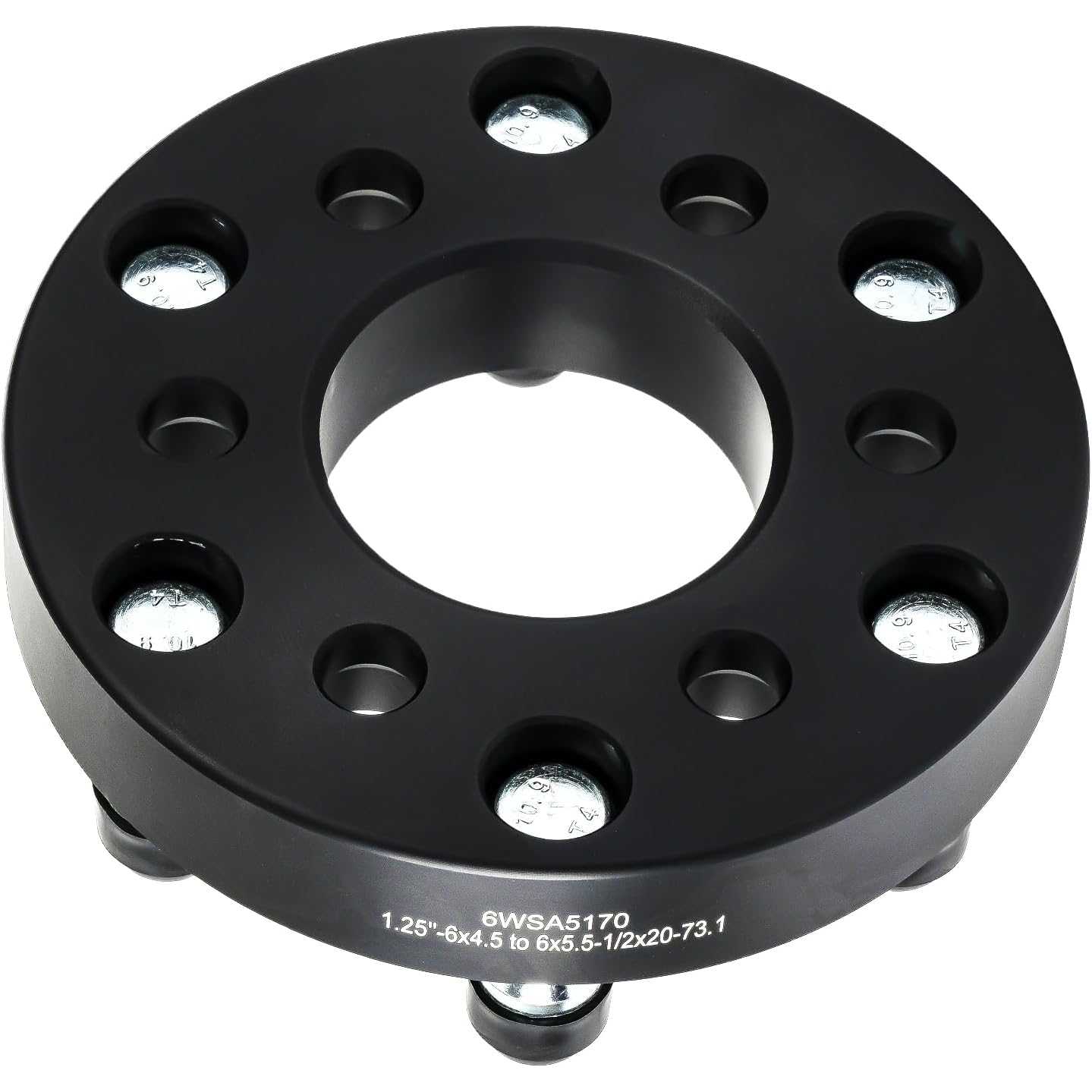 [Wheel Adapters Specification] --- Vehicle Bolt Pattern: 6x4.5"(6x114.3mm) ; | Wheel Bolt Pattern: 6x5.5"(6x139.7mm) ; | Thickness: 1.25 inch ; | Thread Pitch: 1/2"x20 ; | Hub Bore: 73.1mm ; | Recommended torque: 75-85 ft/lbs. !!! Note: If the length of the vehicle bolts exceed the thickness of the wheel adapters, you need to cut the vehicle bolts