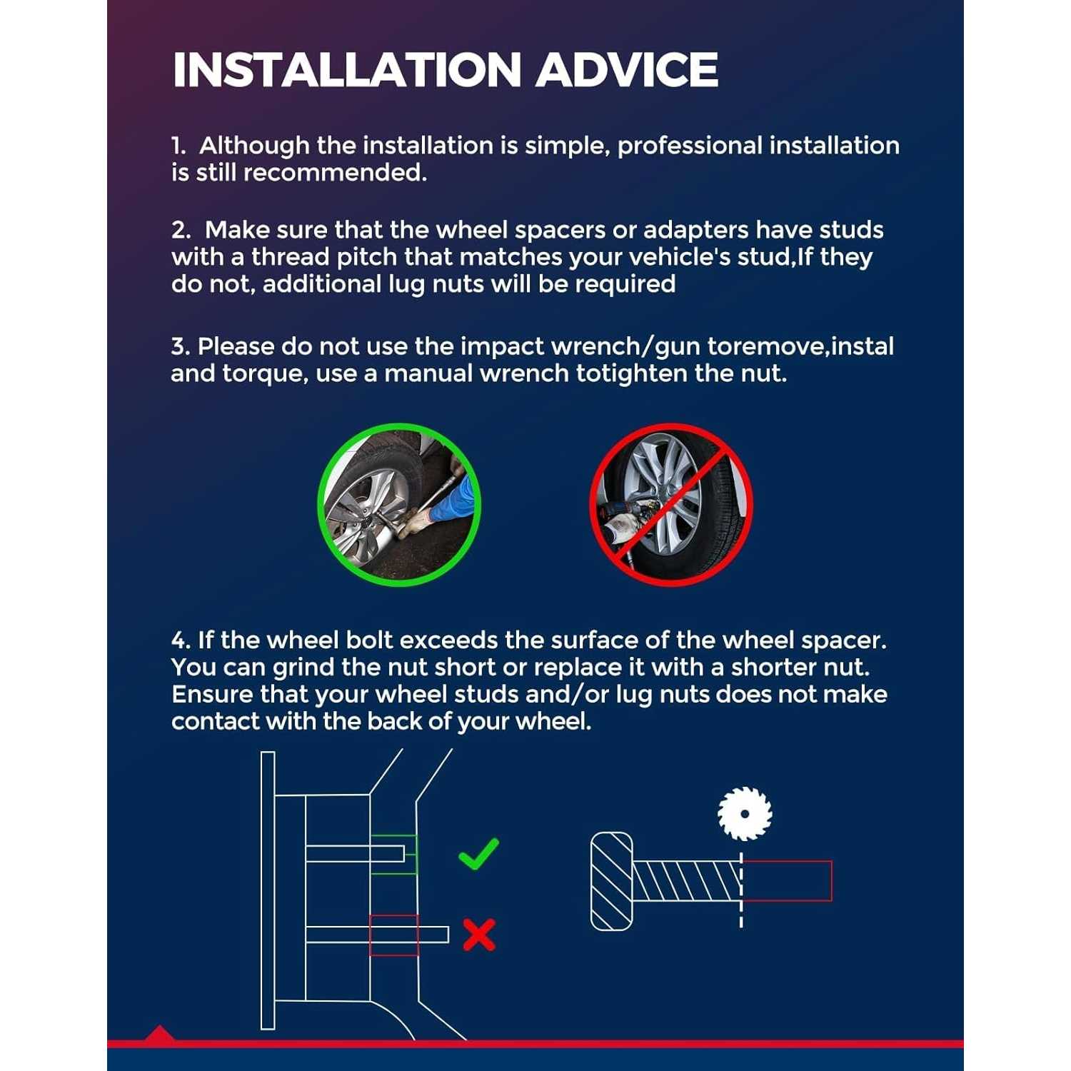 Warm Reminder :Even if a vehicle is listed as being compatible, buyers still need to check: 1) Wheel studs areM14x1.5 threads; 2) You have more than 2 inch of space between your fender and your wheel/tire; 3) Your factory wheel studs are shorter than 2 inch (NOTE: * When installing a bolt on wheel spacer or adapter, trimming the studs will be necessary when the spacer or adapter plate is thinner than your wheel studs are long.)