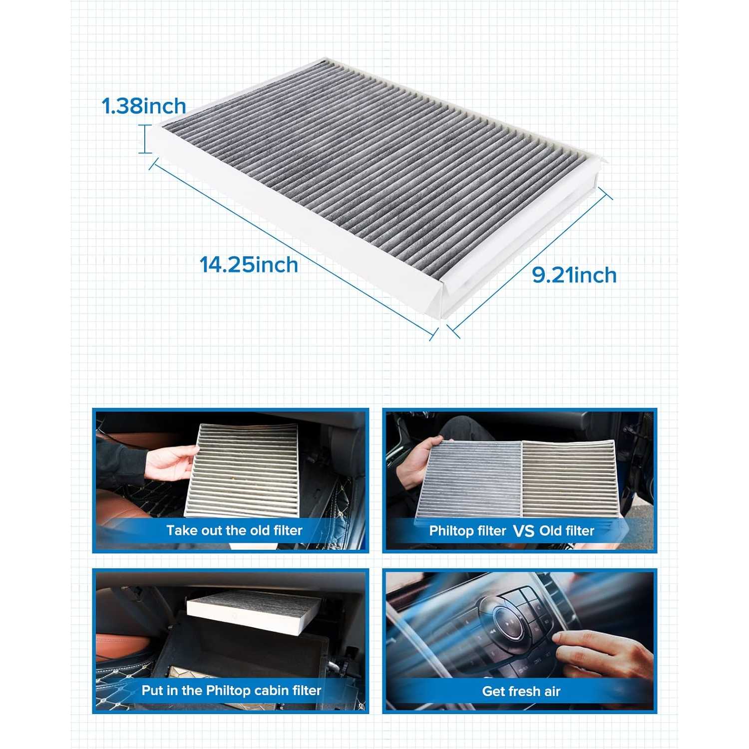 PHILTOP cabin air filter has an Original Equipment standard of 43 layers of folds, filtering particles as small as 0.003 microns. 43-layers cabin air filter has a larger absorption area and longer service life.