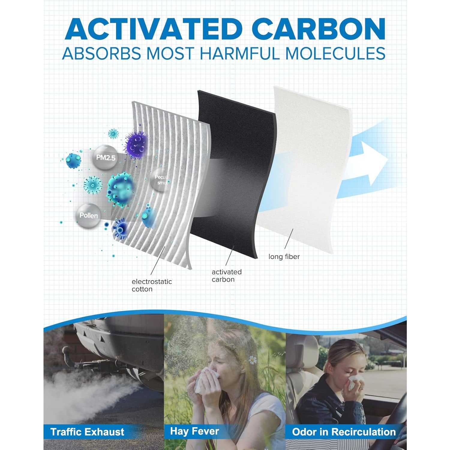 Enhances HVAC Performance: The special structure of the long-fiber layer electrostatic cotton makes the dust-holding area times higher than other flat materials, with enough gaps for air passage to improve the heating and cooling efficiency of HVAC and prevent musty odors from forming inside the car