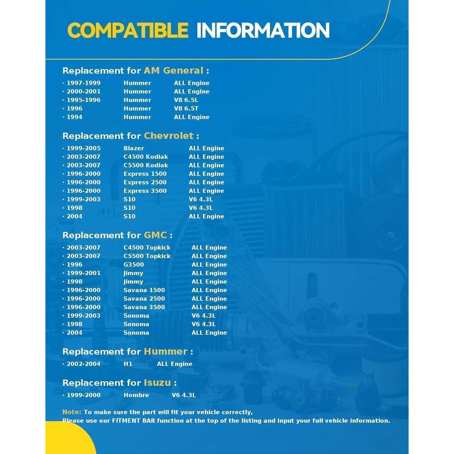 Widely Compatible: PHILTOP AC Compressor with Clutch Compatible withS10 2004, 1998-2003 4.3L, Blazer 1999-2005, Sonoma 2004, 1998-2003 4.3L, Jimmy 1998-2001, Express 3500 1996-2000, Express 1500 1996-2000, Express 2500 1996-2000, Savana 3500 1996-2000, Savana 1500 1996-2000, Bravada 1998-2001, Savana 2500 1996-2000, Hummer 1994, 1997-2001, 1995-1996 6.5L, 1996 6.5T, G3500 1996, H1 2002-2004, Hombre 1999-2000 4.3L, C5500 Kodiak 2003-2007, C4500 Kodiak 2003-2007, C5500 Topkick 2003-2007, C4500 Topkick 2003-2007.Please confirm your vehicle details and old part number before ordering.