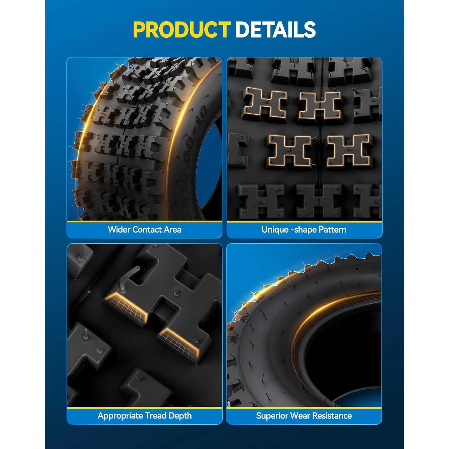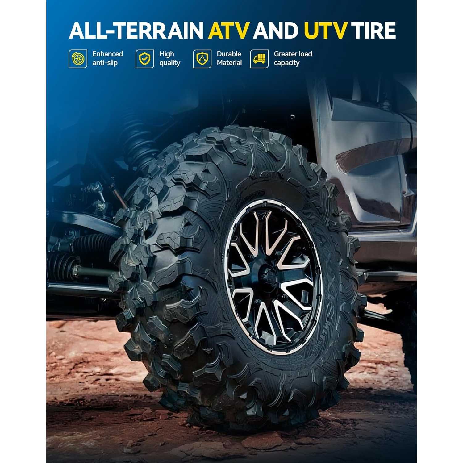 • Product Parameter: Speed Rating-F (F=80km/h)2x ATV Tires Size: 20x10-10; Overall Diameter-20; Overall Width-10; Rim Diameter-10; load-index(LBS)-1160; PSI-14, All Terrain ATV UTV Tires