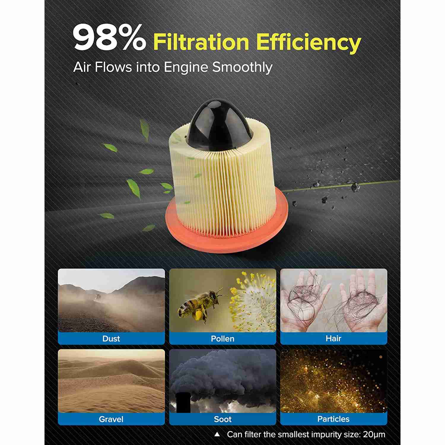 • Excellent filter paper: The strong and durable filter material can still maintain stable filtration performance without deformation or loss of efficacy, even in unfriendly environments, such as high temperature and negative pressure changes,offering 2X protection for your engine