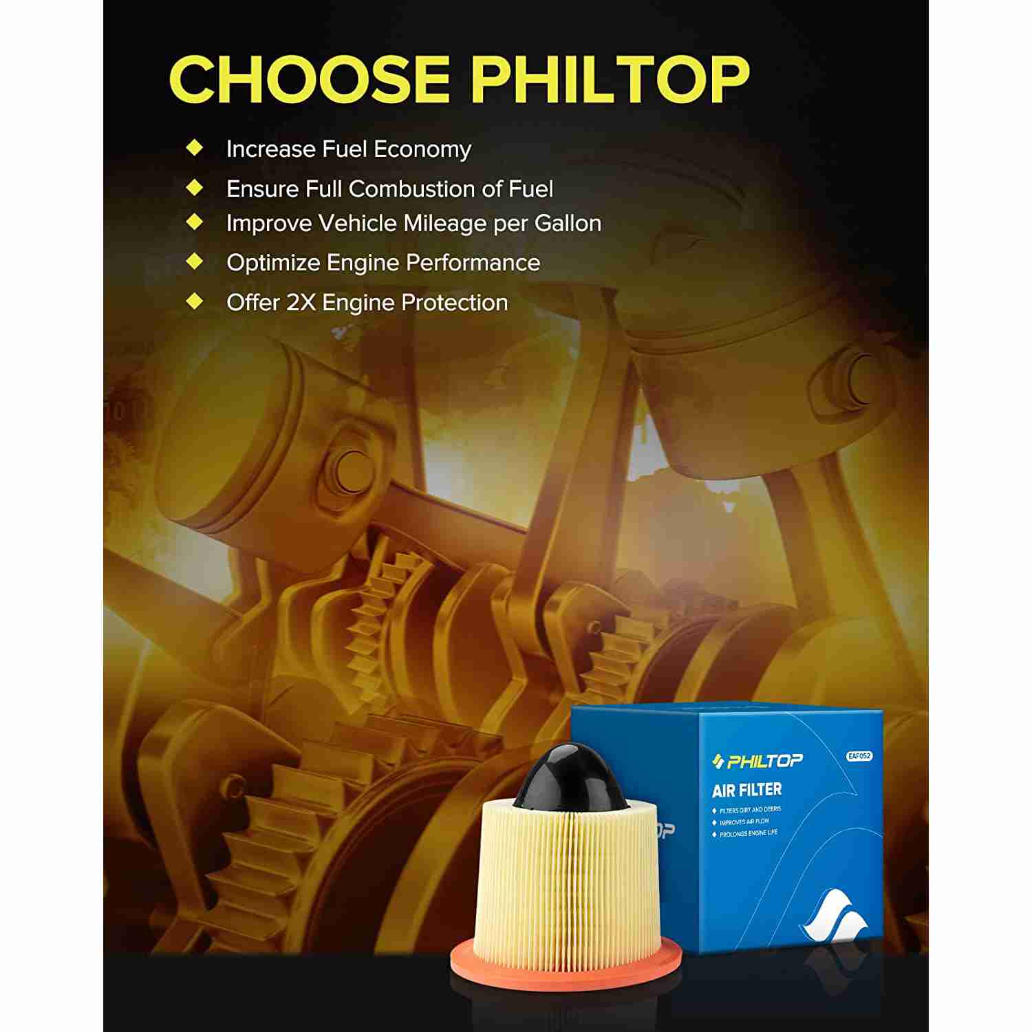 • 98% filtration efficiency: PHILTOP engine air filter is made of high-density synthetic polyester fiber, which can filter out various impurities, hair, fines, dust, and flocs, and provide sufficient clean air for your engine, ensure full combustion of fuel, increase mileage per gallon, and optimize engine performance