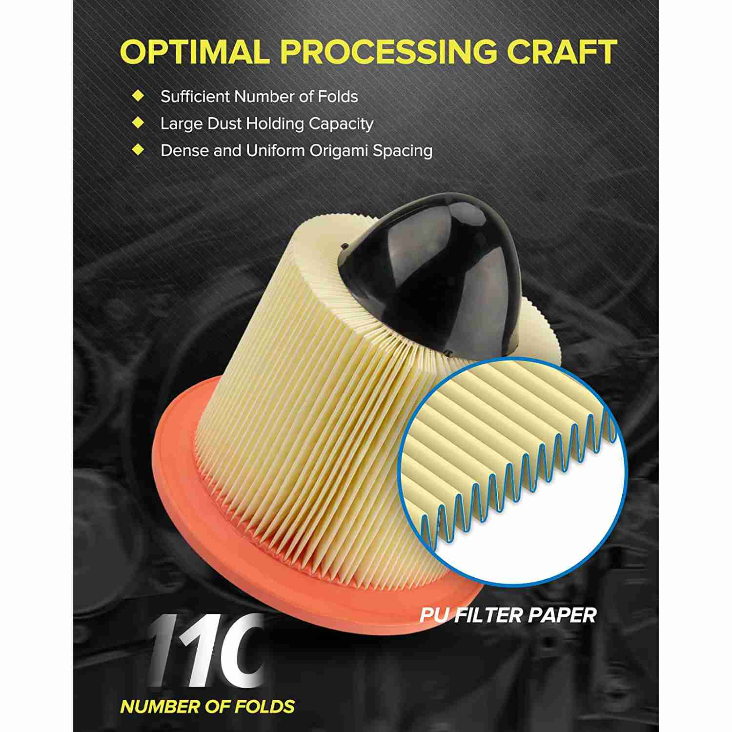 • Maximum dust-holding capacity: More folding layers than standard air filters allow maximum dust and debris holding capacity; the reinforced frame is enough solid and durable, effectively improving the seal performance so that it can reduce noise when sealing dirt