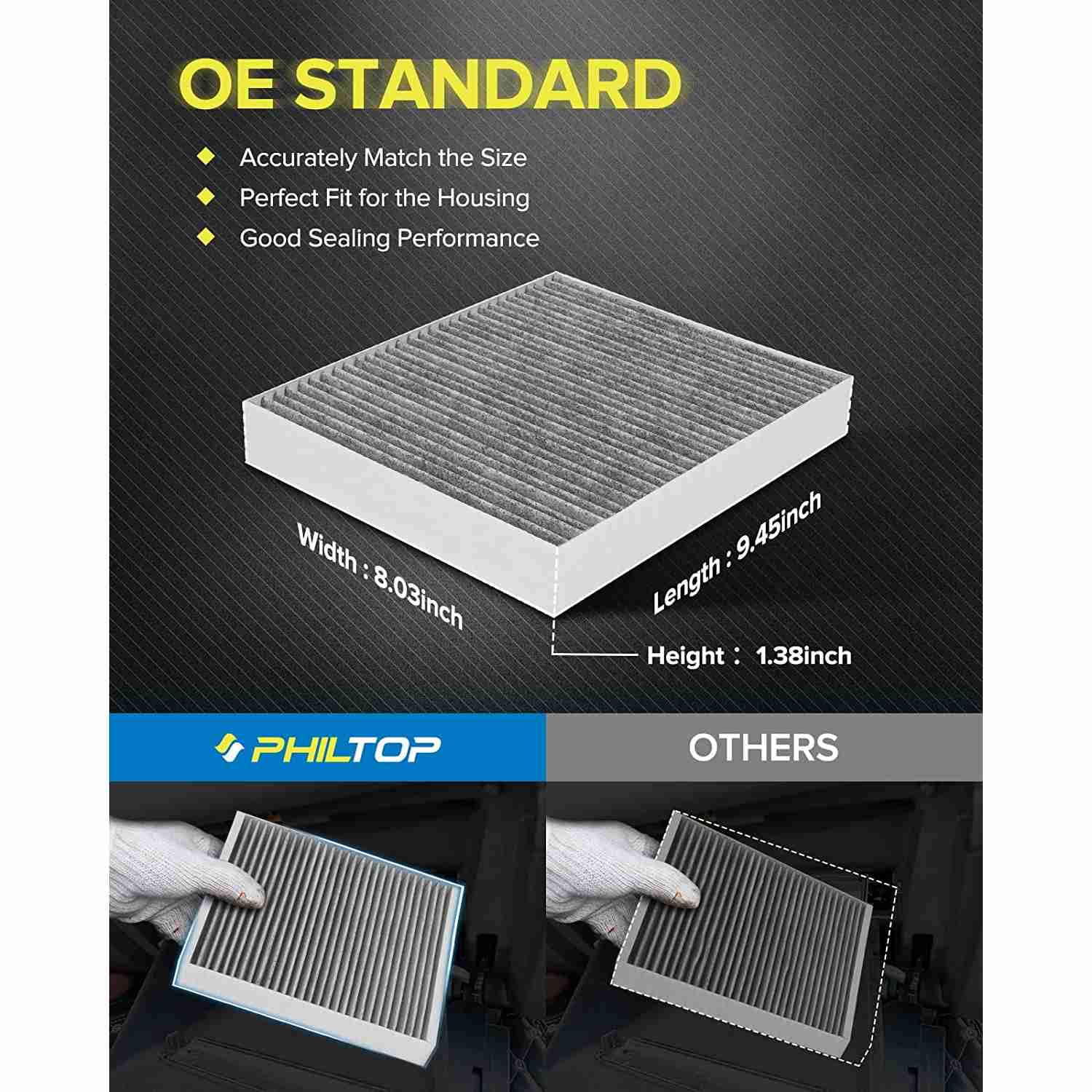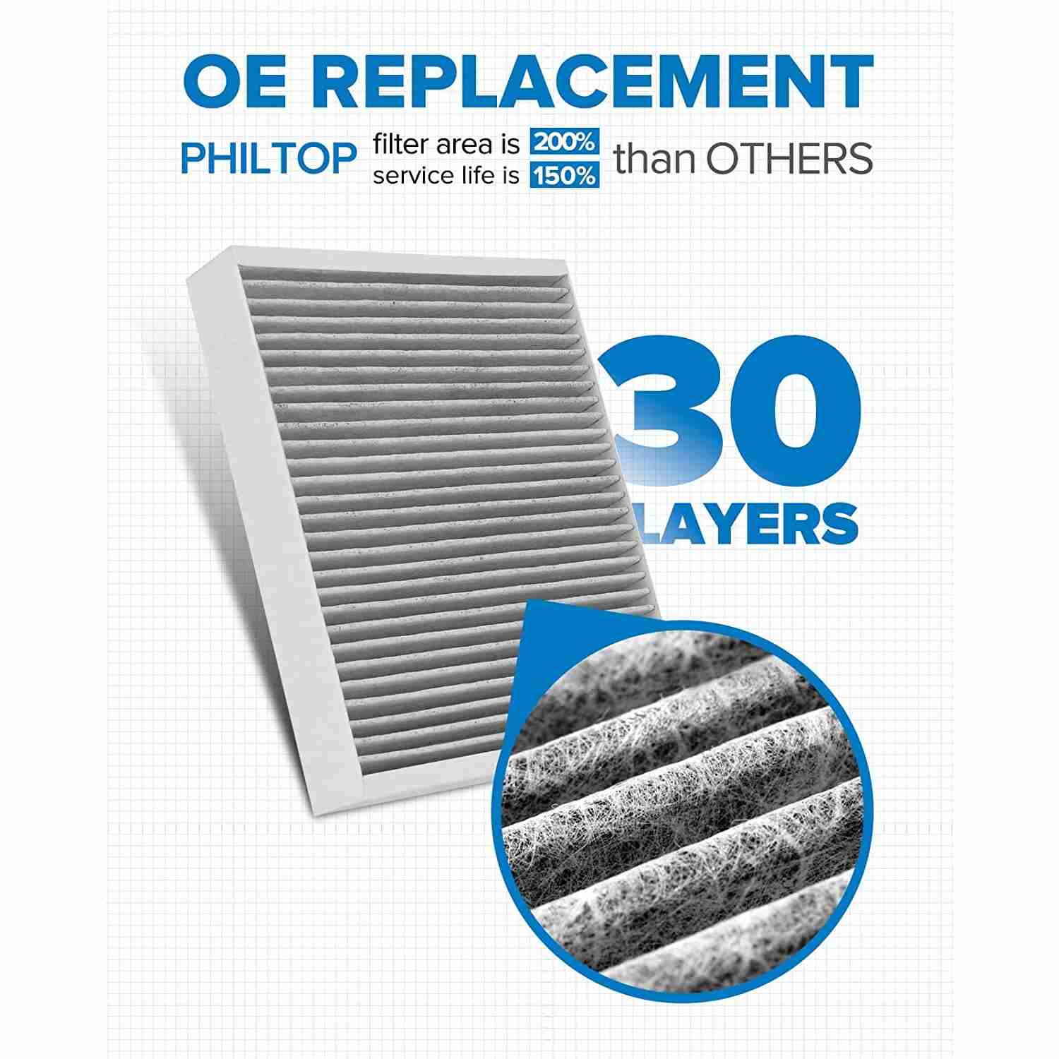 Increased Air Flow: PHILTOP cabin filter provides more air flow to enhances HVAC performance, improves on-board air conditioning heating and cooling efficiency, and effectively prevents musty odors forming inside the vehicle