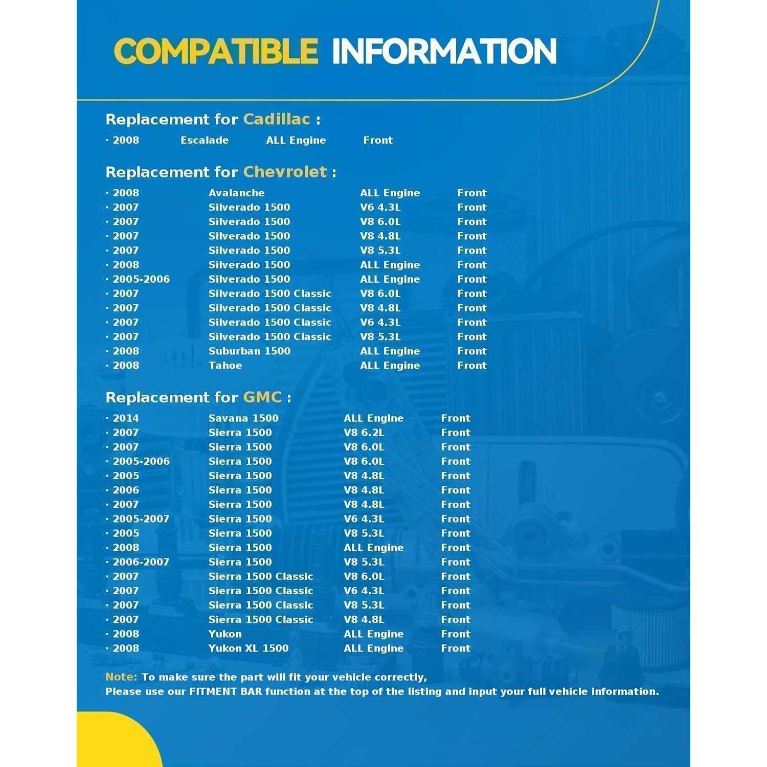 Vehicle Compatibility: Chevrolet 2005-2006 2008 Silverado 1500, GMC 2005-2007 Sierra 1500 5.3L, Chevrolet 2007 Silverado 1500 5.3L, GMC 2008 Sierra 1500, Chevrolet 2008 Tahoe, Chevrolet 2007 Silverado 1500 4.8L, GMC 2005-2007.