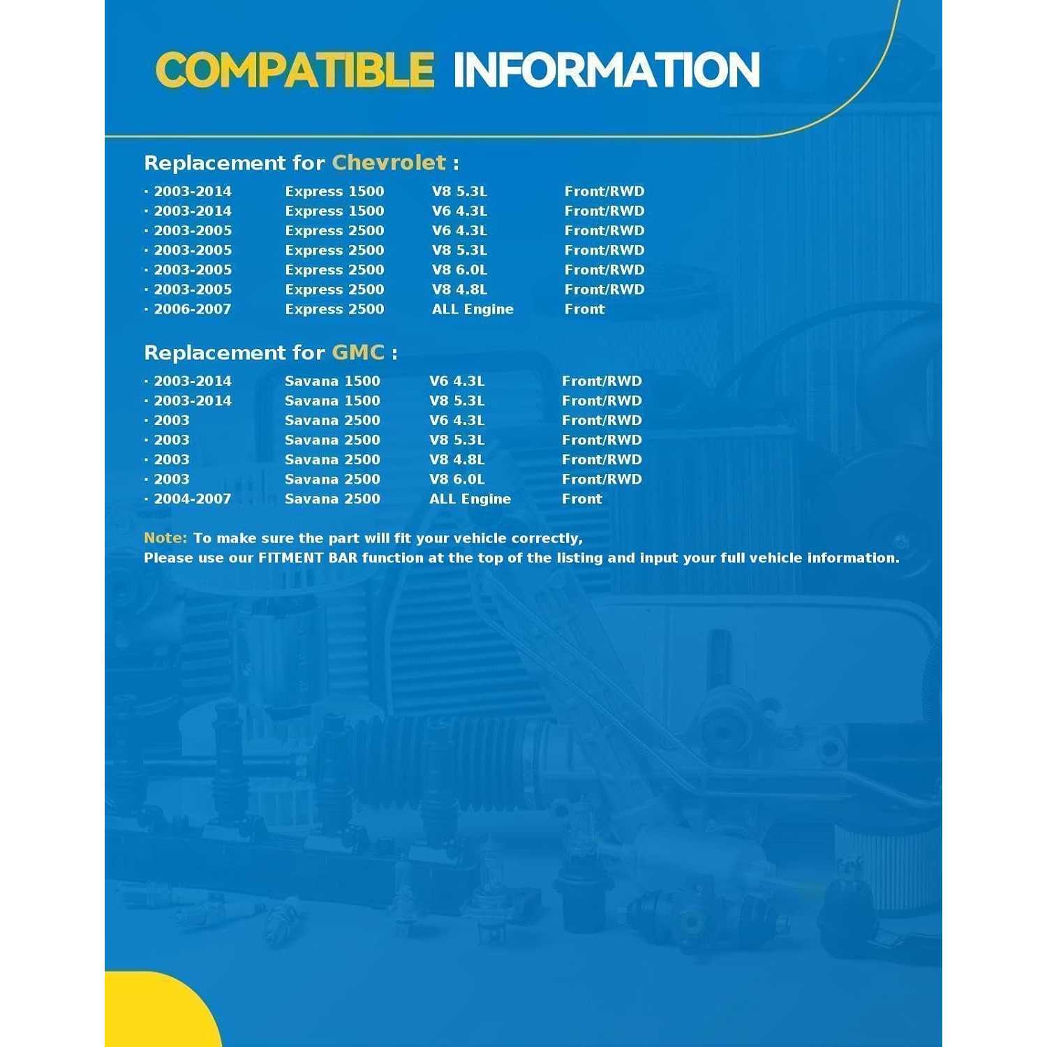 • COMPATIBILITY:for 2003-2014 Chevrolet Express 1500,for 2003-2007 Chevrolet Express 2500,for 2003-2007 GMC Savana 2500,for 2003-2014 GMC Savana 1500