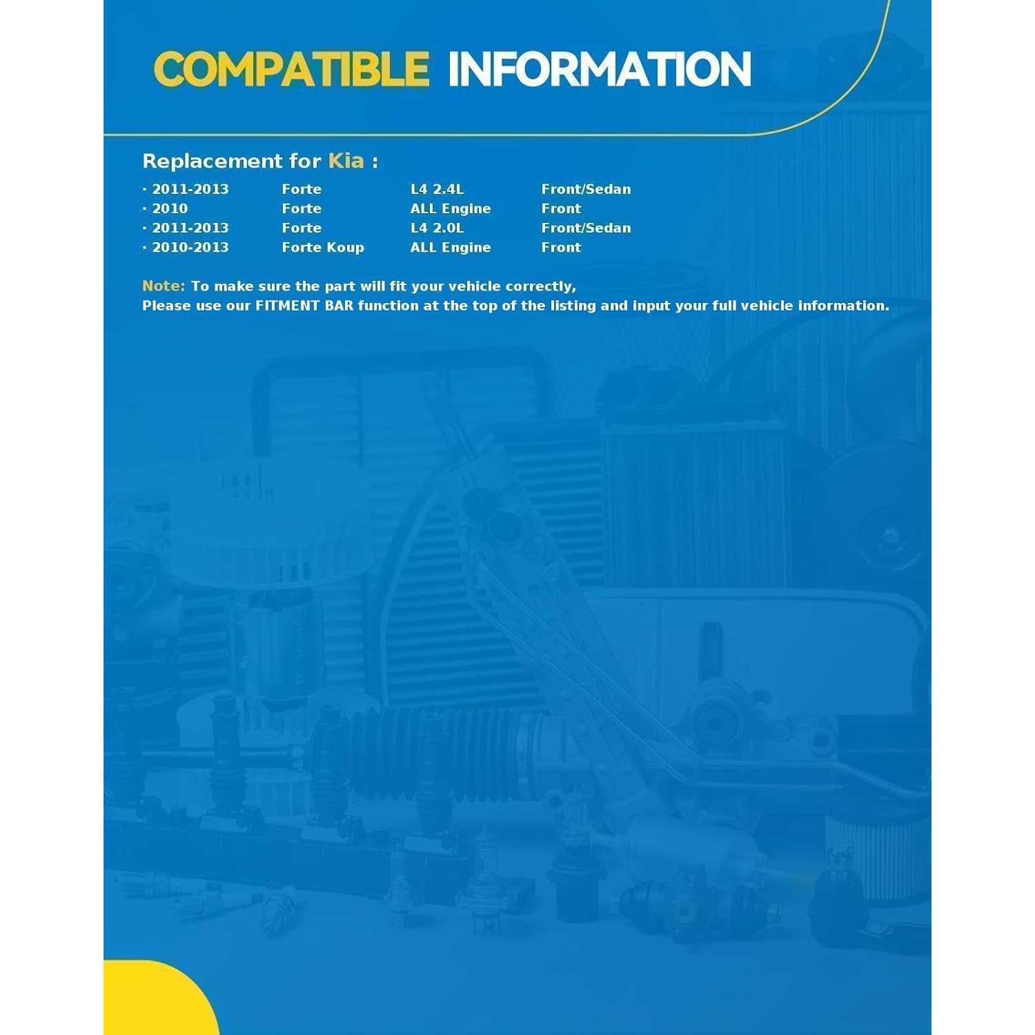 Struts Fitment: PHILTOP Complete Struts Replacement for Forte 2010-2013, Forte Koup 2010-2013. Please Comfirm our products are compatible with your car. Manufacturer Part Number: 172720+172721