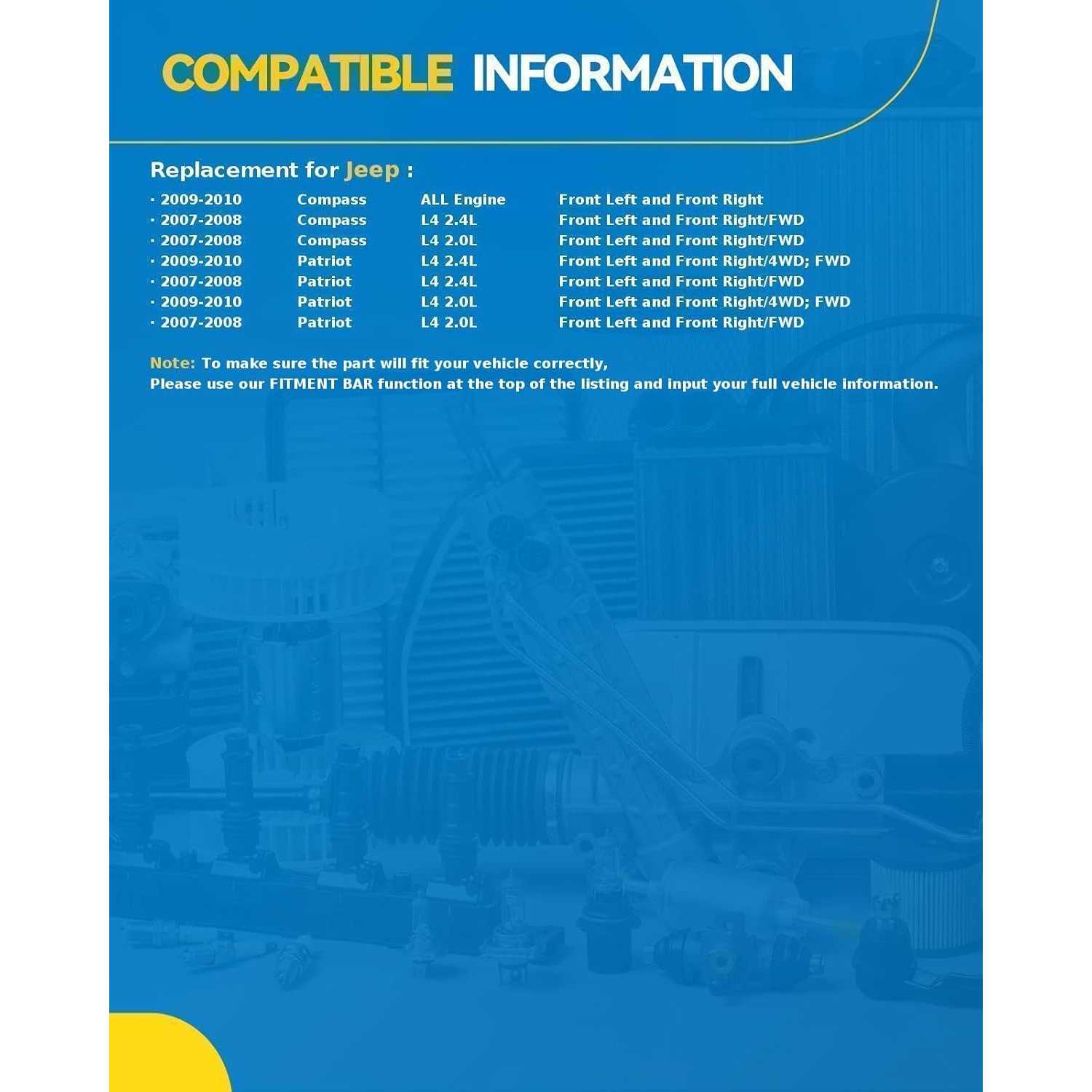 Vehicle compatibility: The PHILTOP Front Left and Front Right Strut Shocks Assembly is compatible withJeep 2007-2010 Patriot,Jeep 2007-2010 Compass,.