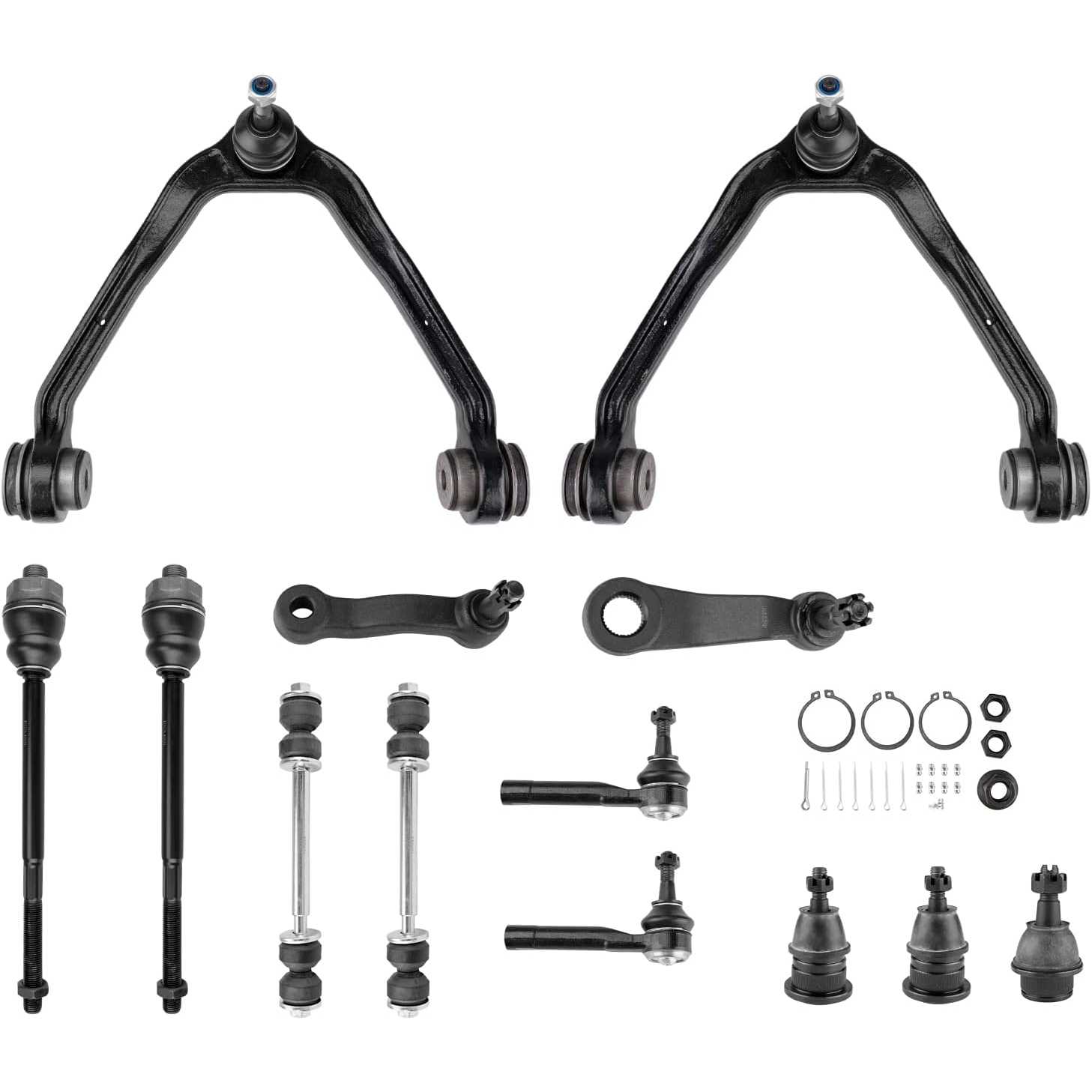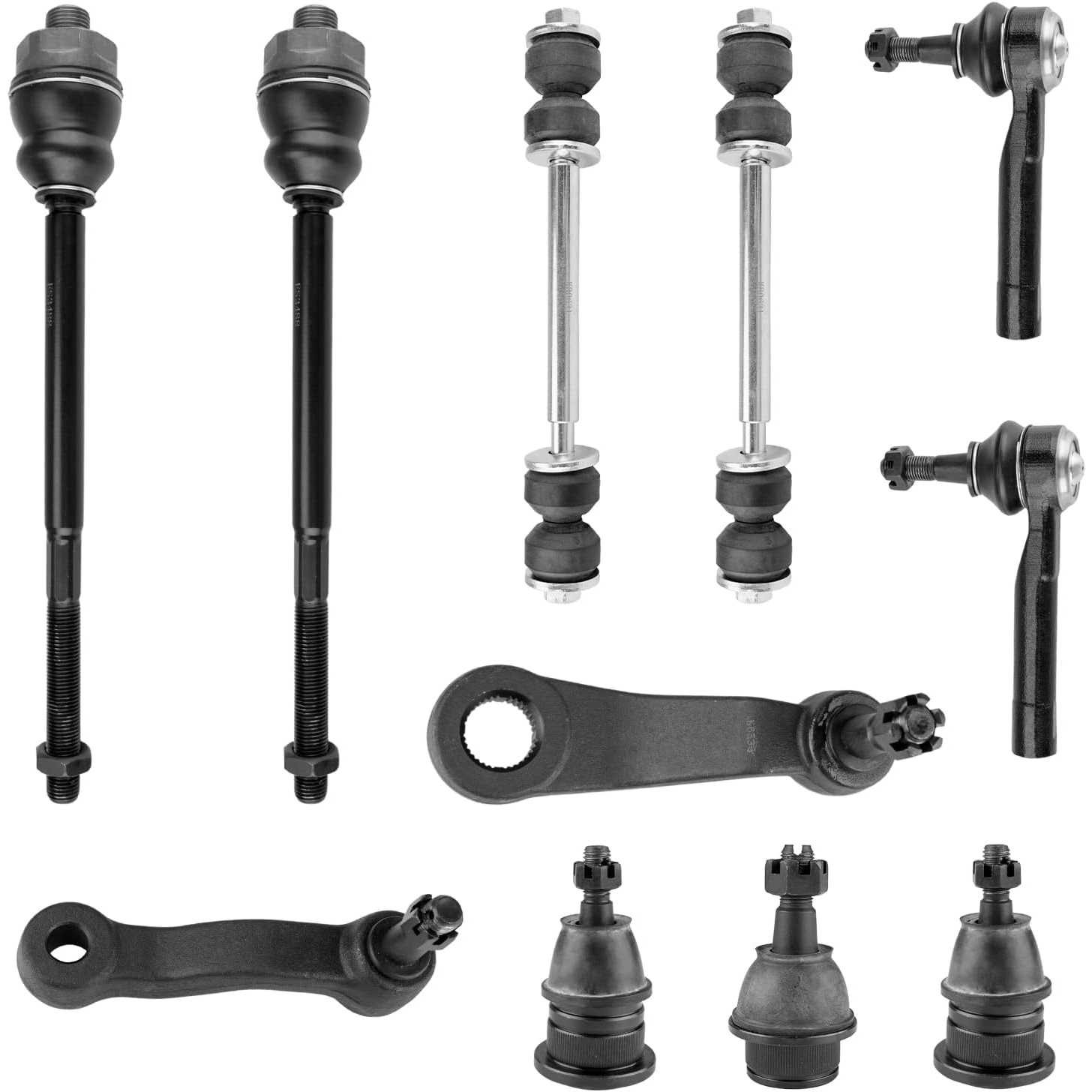 Kit Includes: 2 x Part # Front Upper Control Arm and Ball Joint Assembly - K80826, 2 x Part # Front Lower Ball Joints - K6541 , 2 x Part # Front Stabilizer Bar Link Kits - K8987 , 2 x Part # Front Outer Tie Rod End - ES3493T , 2 x Part # Front Inner Tie Rod - ES3488 , 1 x Part # Pitman Arm (With 4 Grooves) - K6536 , 1 x Part # Front Idler Arm - K6534 , 1 x Part # Idler Arm Assembly - K6723