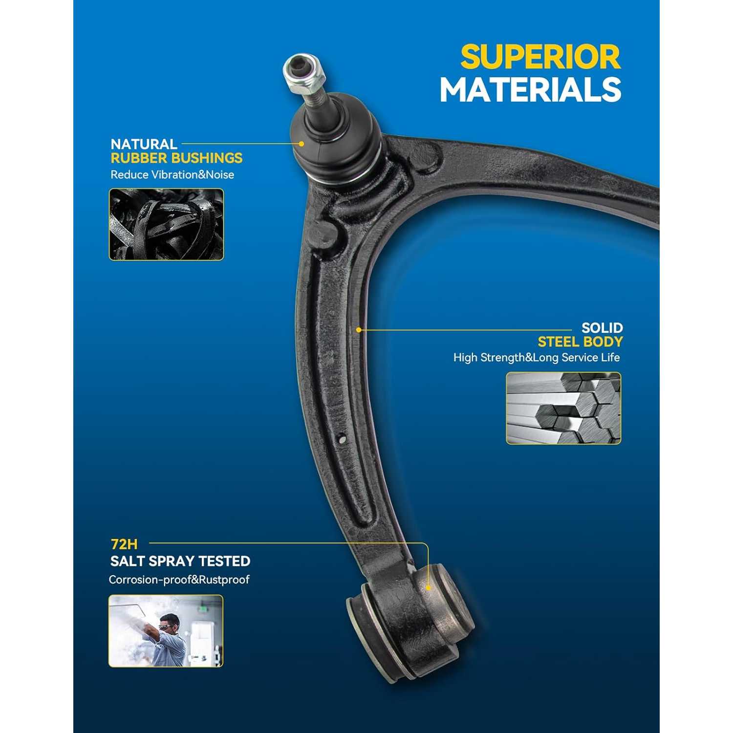 New Bushing: The new bushing of the upgraded control arm-polyurethane bushing avoids the unnecessary movement and elasticity of the suspension parts, prevents the car from tilting excessively, and makes the driving control more accurate.