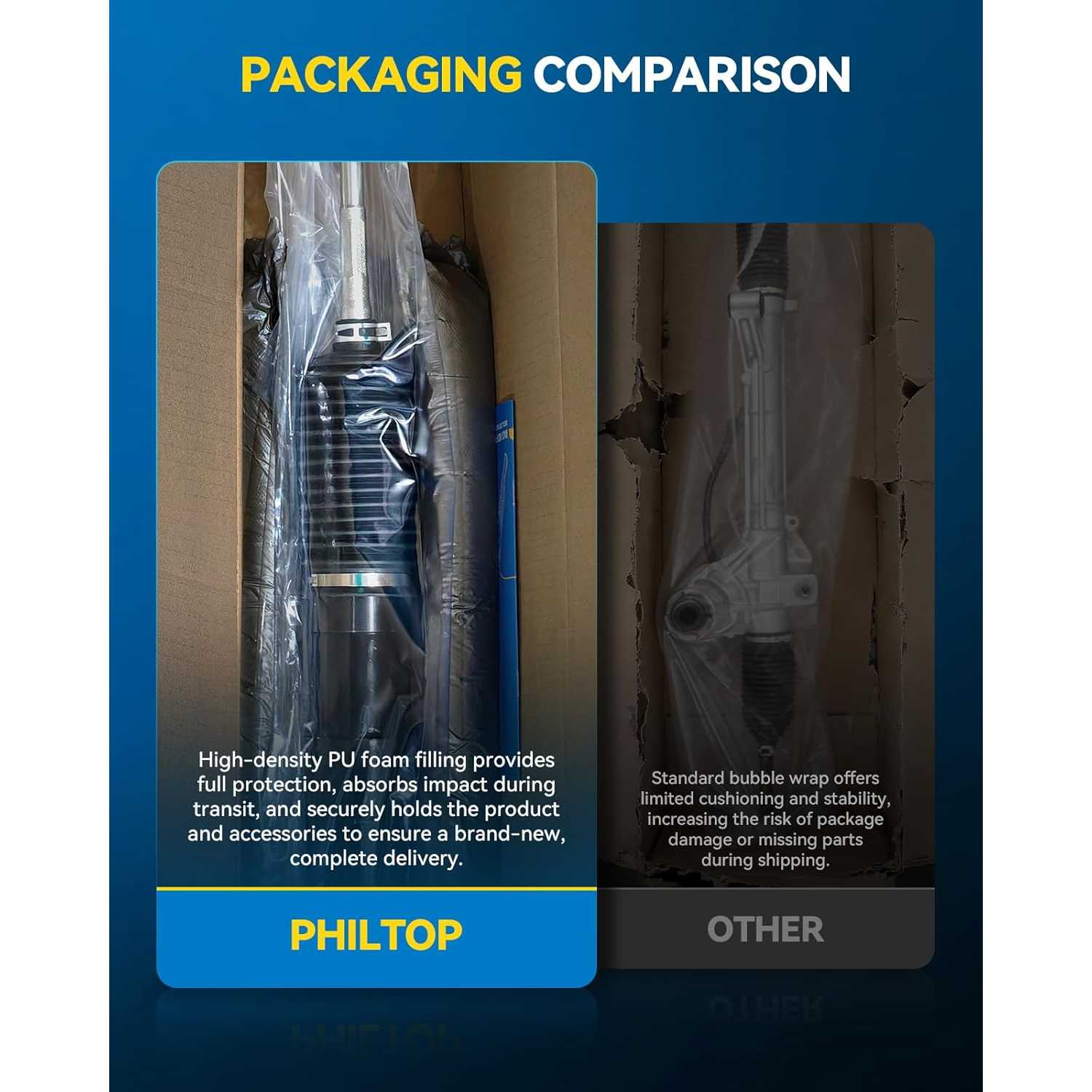 [Durable Performance]: PHILTOP steering rack and pinion adopts corrosion-resistant oil seals and lip seals, and butyl rubber sealing covers. The 360°dust cover is fully protected to effectively prevent dust and dirt from entering the rack gear to cause wear and oil leakage. Service life more than 120,000 miles, 24-month unlimited mileage guarantee.