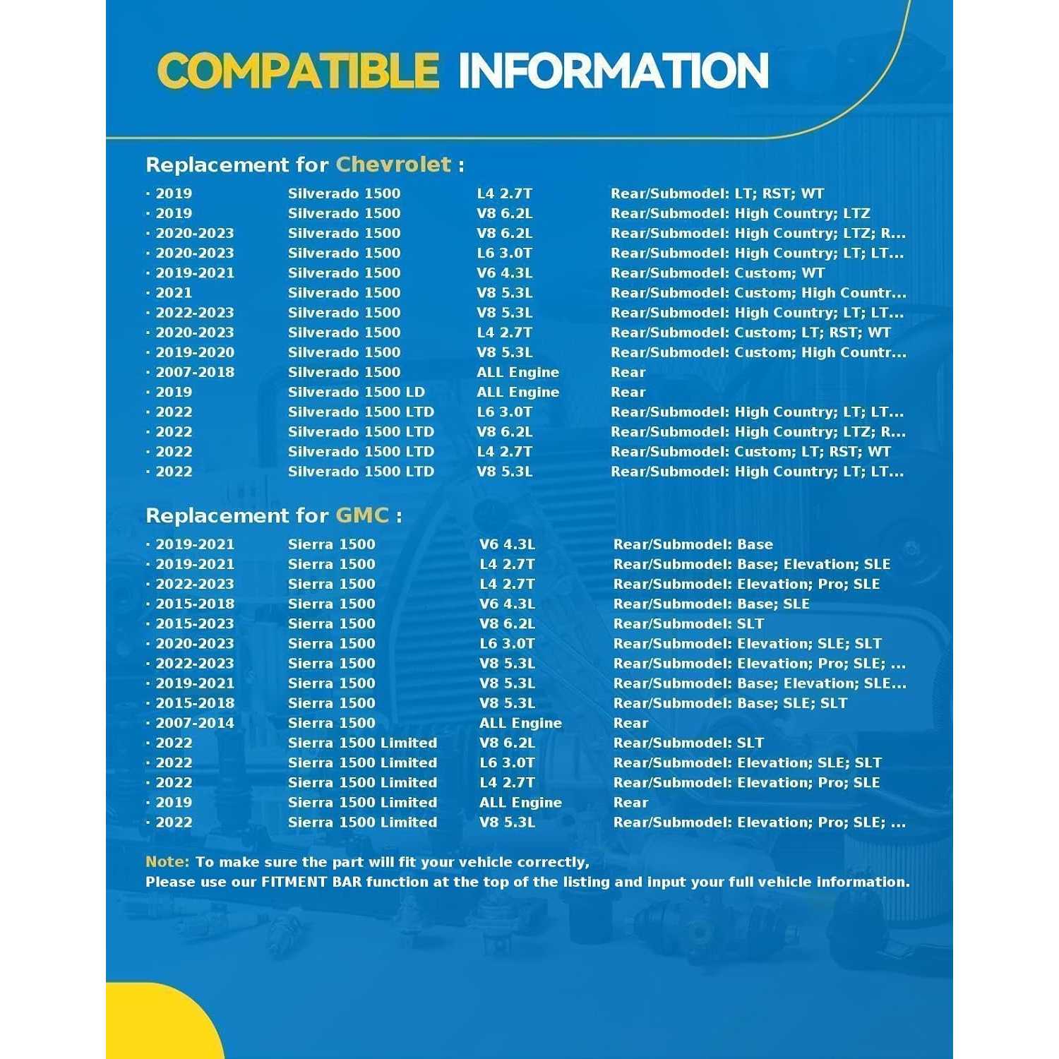 Fitment: PHILTOP Strut & Coil Spring Assembly Fits Silverado 1500 2007-2023, Sierra 1500 2007-2023, Silverado 1500 LTD 2022, Silverado 1500 LD 2019, Sierra 1500 Limited 2019 2022.Before purchasing, please make sure that the shock absorber is suitable for your vehicle by using the fit filter.